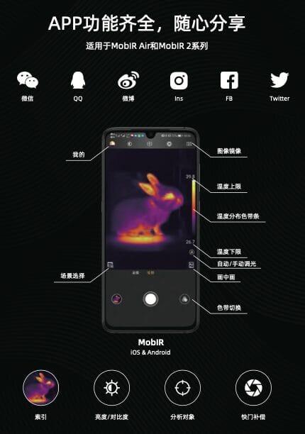 MobIR Air 手機型熱影像鏡頭,可將您的手機迅速變成一台熱像儀,讓您擁有肉眼不具備的觀測能力,既可以在黑暗中視物,還能輕鬆探測一切物體的溫度。
